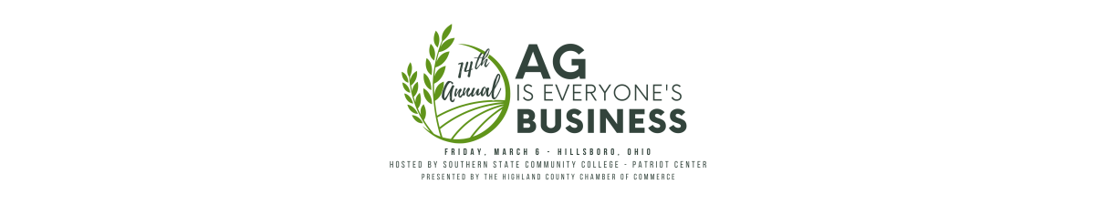 The Highland County Chamber of Commerce is happy to announce the presentation of the 14th Annual Ag is Everyone's Business Event on Friday, March 6, 2026. This year’s event will be held at Southern State Community College’s Patriot Center. Southern State Community College is located at 100 Hobart Drive in Hillsboro. The event will begin mid-morning and conclude with lunch.